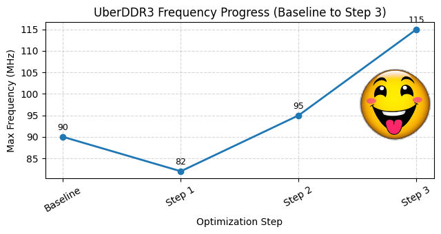 The table below shows how maximum frequency evolved as each change was applied. The intent here is not to show a smooth or ideal progression, but to reflect how timing closure actually played out as different bottlenecks were addressed.